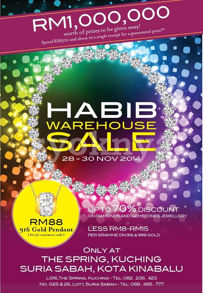 Habib Jewels Jewellery Warehouse Sale Clearance. Enjoy discounts up to 70% on diamond jewels, gold jewels, silver jewels, platinum jewels, pearl jewels and many more. ** RM8 to RM15 per gram discounts for 916 or 999 Gold. ** RM1,000,000 worth of prizes to be given away! Spend RM500 and above in a single receipt for a guaranteed prize!* ** 916 Gold Pendant at RM88 only (For first 50 customers). In 1958, HABIB was first established as M.A. Habib Mohamed by founder Datuk Haji Habib Mohamed Abdul Latif. Its first shop was located on Penang's Pitt Street, also popularly known as the island's "Jewellers' Corner". It is still there today as HABIB's Pioneer Showroom. Under the helm of the founder's son, Dato' Meer Sadik Habib, the company evolved from a humble family concern to become Habib Corporation Berhad. It became Malaysia's first listed jeweller in 1998. HABIB is today reputed for its fine crafted jewellery that embodies avant garde creativity, superior quality gems and expert craftsmanship. For three consecutive years (2010 to 2012), HABIB has been ranked amongst the Top 5 Asia brands in the retail (jewellery) category in Campaign Asia Pacific and TNS' Asia's Top 1,000 Brands rankings. Over the years HABIB has also achieved numerous awards including the Brand Laureate Award, Reader's Digest Trusted Brands Awards, Malaysian Retail Association Award as well as the Fair Price Award. HABIB has successfully expanded its business throughout the years to emerge as a fully integrated jeweller involved in wholesaling, retailing, manufacturing, marketing and franchising. Date : 28th Nov 2014 (Friday) - 30th Nov 2014 (Sunday) 10.00a.m to 10.00p.m Venue : No. G25 & 26, Lot 1, Suria Sabah Shopping Mall, Kota Kinabalu, Sabah, Malaysia. Kindly visit to Habib Jewels Malaysia facebook & website at https://www.facebook.com/habibjewels & http://www.habibjewels.com/ for more details. ********************************************************************************************** TIP: Have difficulty to the location? Let us guide you to the destination by using your Smartphone GPS Navigation Apps (Waze, Apple Maps & Google Maps). Easy 1, 2, 3 steps: - Use Smartphone browser (Safari / Chrome) or scan the ad QR Code browse to this advertisement. - Tap on the "How to get there". - Tap on preferred app to direct you to the location. Lets 'Share' this advertisement to your FB friends if find this good and don't forget to 'Like' Syoknya Malaysia page for your support, thanks! **********************************************************************************************