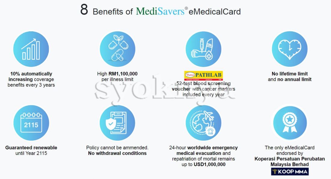 ✅Room and Board* RM400 ✅Annual NO limit ✅Lifetime NO limit ✅Per illness coverage limit UP TO *RM1.1mil* ✅Multiple admission in a year is allowed. ✅Every 3 years room and benefits *auto increased by 10%* ✅365 days admission in hospital (others only 120 days) ✅No co-insurance ✅Cashless hospitalisation ✅Renewable til age 100 + Full Claim ✅24-hour worldwide emergency medical evacuation and repatriation of mortal remains up to USD1,000,000 ✅Free 52 types of blood test screening voucher with cancer markers included every year ✅The only eMedicalCard endorsed by Koperasi Persatuan Perubatan Malaysia Berhad * ✅In-patient* All covers and Full Claim * ✅Out-patient* Kidney dialysis and cancer treatment, 145k each