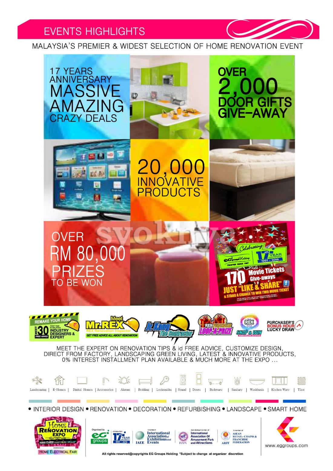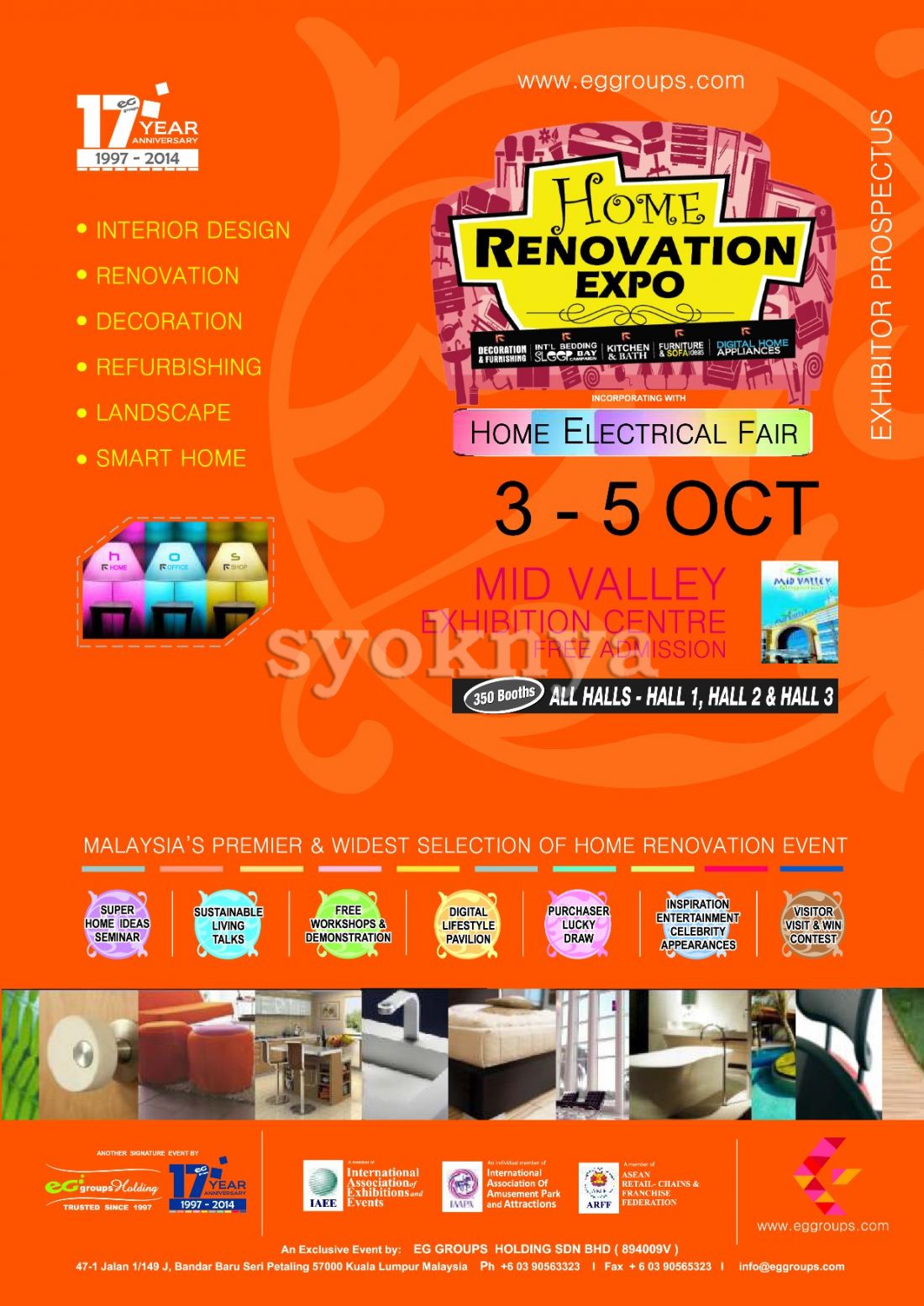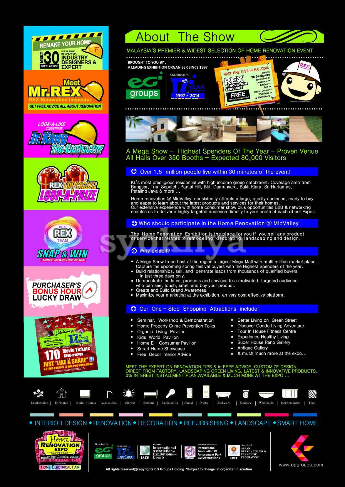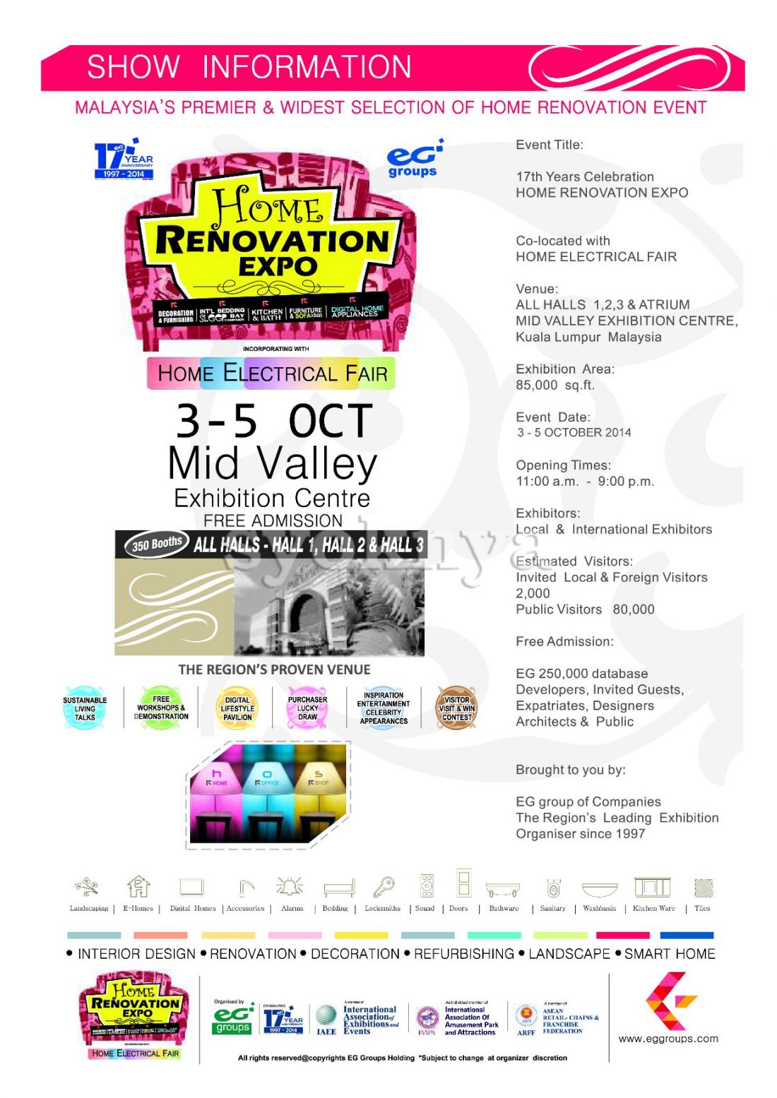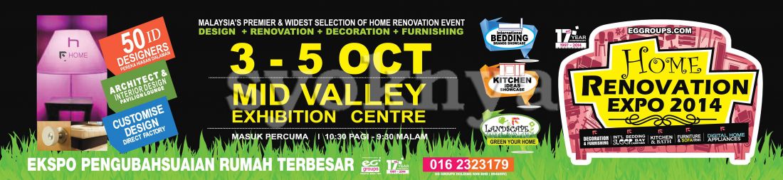 Rex Home Renovation Expo 2014 - Malaysia's Largest, Premier & Widest Selection of Home Renovation Event. ** Admission is FREE. Event Title: 17th Years Celebration HOME RENOVATION EXPO Co-located with HOME ELECTRICAL FAIR. Exhibition Area: 85,000 sq.ft. Estimated Visitors: Invited Local & Foreign Visitors 2,000 and Public Visitors 80,000. Brought to you by: EG group of Companies - The Region's Leading Exhibition Organiser since 1997. Exhibitors (Local & International Exhibitors) will participate consist of Architectural & Building Material, Financial Institution, Home Accessories, Digital Lifestyle, Smart Home, Organic Living, Health & Lifestyle, Interior Designing, Renovation Services, Furniture, Mattresses, Flooring, Bathroom Fixtures & Accessories, Security System, Home Appliances, Paints & Wallpaper, Landscaping, Kitchenware, Table ware, Lightings, Curtains & Blinds, Wardrobe, Gates & Doors, Roofing & Window, Decorative Items, Furnishing and related industries. EG Groups Holding combine creativity, professionalism and experience as expert organisers of national and international trade shows. Since 1997 we have built a reputation as a leader in the field of exhibition management staging major shows for a diverse range of industries. The company has managed more than 200 major trade and consumer shows. Driven by an entrepreneurial spirit, the shows are developed from initial concepts through to staging. The company, with its operates throughout Asia, and is linked internationally through our network. Date : 3rd Oct 2014 (Friday) - 5th Oct 2014 (Sunday) 11.00a.m to 9.00p.m Venue : All Halls 1,2,3 & Atrium, Mid Valley Exhibition Centre, Mid Valley Megamall, Mid Valley City, Kuala Lumpur, Malaysia Kindly visit to EG Groups Holding Malaysia facebook & website at https://www.facebook.com/rexexpo & http://www.eggroups.com/ for more details. ********************************************************************************************** TIP: Have difficulty to the location? Let us guide you to the destination by using your Smartphone GPS Navigation Apps (Waze, Apple Maps & Google Maps). Easy 1, 2, 3 steps: - Use Smartphone browser (Safari / Chrome) or scan the ad QR Code browse to this advertisement. - Tap on the "How to get there". - Tap on preferred app to direct you to the location. Lets 'Share' this advertisement to your FB friends if find this good and don't forget to 'Like' Syoknya Malaysia page for your support, thanks! **********************************************************************************************
